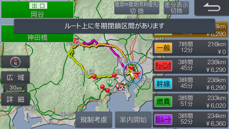 探索されたルート上に冬期に通行できなくなる区間が含まれる場合は、探索画面にメッセージが表示されます。冬期閉鎖区間を自動回避しない設定になっているときは、本操作で通行止め区間を通らないルートを探索します。