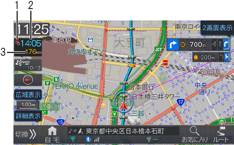 経由地/フェリー航路が設定されている場合は、タッチするたびに目的地/経由地/フェリー乗り場までの情報に切りかわります。