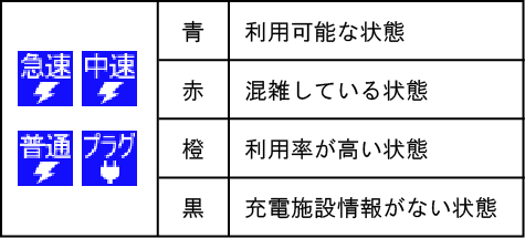 電気自動車用の充電施設を充電方法(急速・中速・普通・プラグイン)に応じたマークで地図上に表示します。また、周辺の充電施設を探すこともできます。