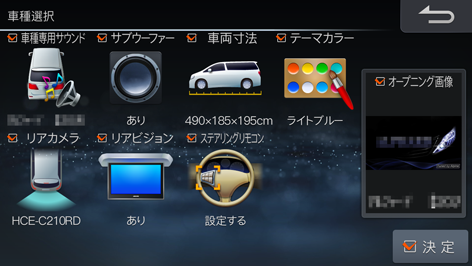 メーカー名を選択して[決定]にタッチし、続けて車種名とグレードを選択して[決定]にタッチします。