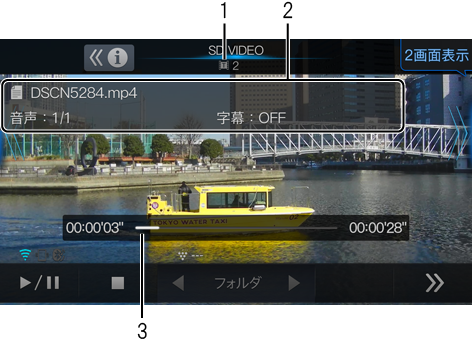パソコン等を使用してSDカードに保存したビデオデータ(AVI/MP4/MKV)を再生します。再生中に画面にタッチすると操作画面が表示されます。