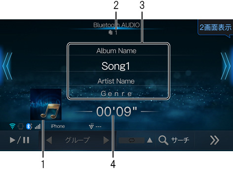 お使いの携帯電話のAVRCP(BLUETOOTH接続して音楽再生するためのプロファイル)のバージョンによって、再生画面に表示される内容や操作が異なります。下記画面は、AVRCPバージョン1.6に対応したBLUETOOTH AUDIO機器を接続したときの表示例です。