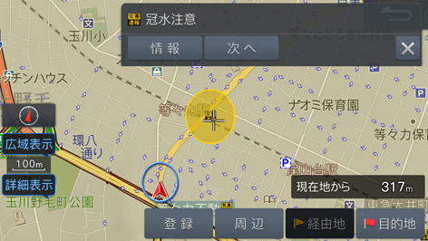 VICS情報で受信した大雨や大雪、津波など気象情報や、災害に関する情報の範囲を地図上に表示するかどうかを設定します(初期設定値は「する」)。