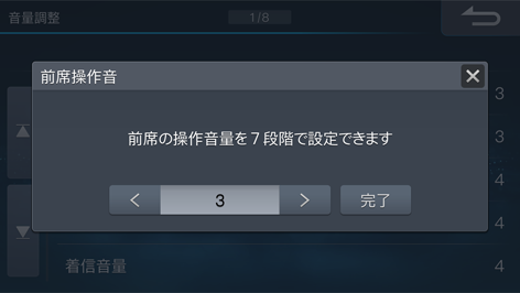 フロントスピーカーから出力される、本機スイッチを押した時の操作音の音量を調整します。操作音をOFFにすることもできます(初期設定値は「3」)。