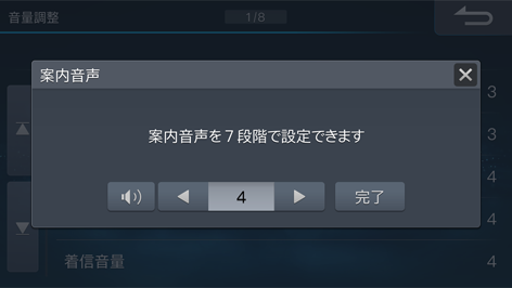 ナビゲーション案内音声の音量を調整します。音声をOFF にすることもできます(初期設定値は「4」)。