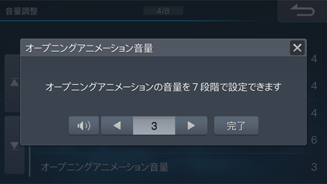 オープニングアニメーションの音量を調整します(初期設定値は「3」)。