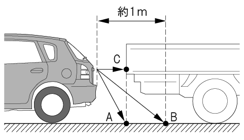 画面では距離目安マークにより約1m先(Bの位置)にトラックが駐車してあるように見えますが、実際にはAの位置まで後退するとぶつかります。画面ではA、B、Cの順に近く見えますが実際の距離はAとCは同じ距離で、BはAやCより遠い距離にあります。