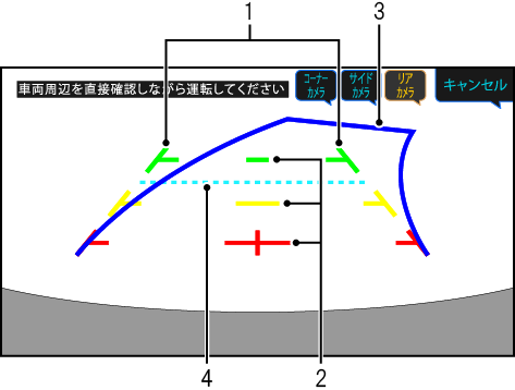 車幅延長マークは路面上の距離を示す目安となりますので、画面に立体物が映しだされた場合は実際の距離感とは異なります。