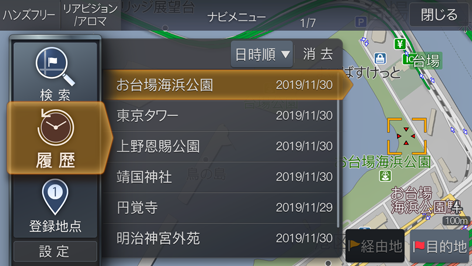 以前目的地に設定した地点を、リストから選択することができます。目的地履歴は新しいものから順に最大200件まで記憶します。