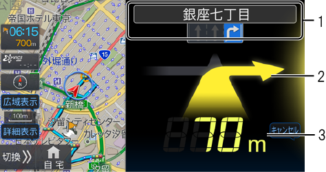 ・音声案内設定が信号・交差点案内設定時には、地図データ収録の信号機データを元に残信号・交差点数を表示・案内します。ただし実際の道路状況と異なる場合や距離で表示・案内する場合があります。