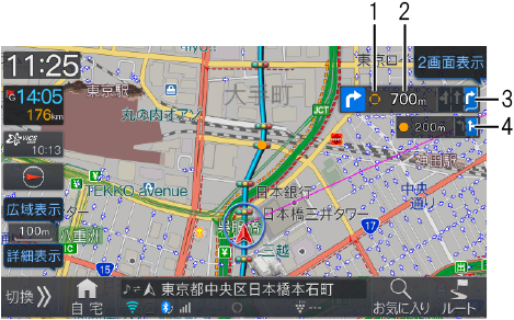 1.レーン情報がある交差点は が表示されます。右左折する場合は交差点拡大図が表示されるタイミングでが表示されます。