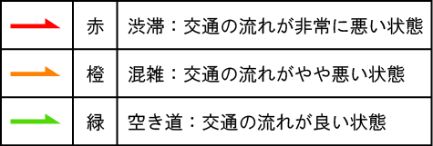 渋滞地点や渋滞区間などを地図上に矢印で表示します。