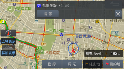 電気自動車用の充電施設を充電方法(急速・中速・普通・プラグイン)に応じたマークで地図上に表示します。また、周辺の充電施設を探すこともできます。