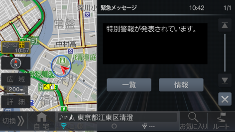 大雨や大雪、津波など気象に関する情報を受信すると緊急情報画面が表示されます。