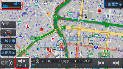または現在地画面のオーディオ操作スイッチをタッチするとミュートすることができます。