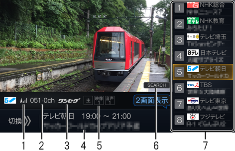 プリセット番号、放送局ロゴマーク、放送局名、番組名を表示します。