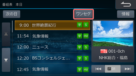 番組表画面で[ワンセグ]にタッチすると、ワンセグの番組表を表示します。