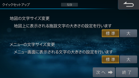 地図上に表示される施設名称の文字の大きさと、メニューの文字サイズを選びます。「地図の文字サイズ変更」と「メニューの文字サイズ変更」の[標準]または[大]にタッチして選び、[次へ→]にタッチします。