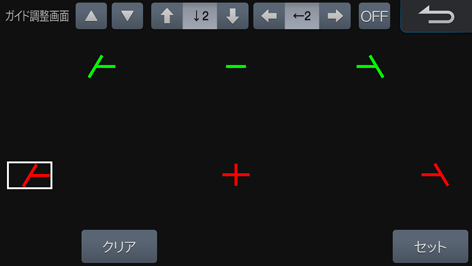 [↑][↓][←][→]にタッチしてガイドの位置を調整します。[OFF]または[ON]にタッチすると、選択したガイドを非表示・表示します。調整が済んだら[セット]にタッチします。
