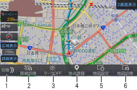 地図画面下部の操作スイッチは、切換スイッチにタッチするたびに操作スイッチ内容も変わります。操作スイッチ表示をOFFにすることもできます。