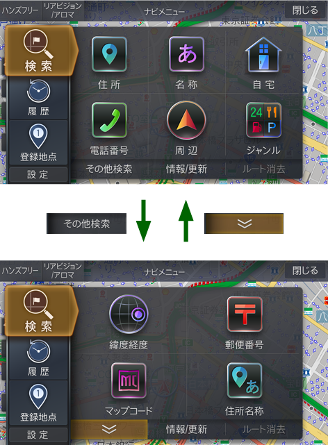 [検索][履歴][登録地点]にタッチすると、それぞれのメニュー画面が表示されます。