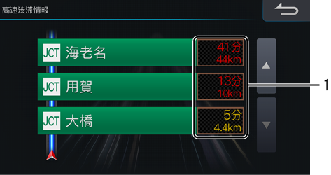 ルート案内中に、VICSの渋滞情報を受信して高速道路上のJCT(ジャンクション)やIC(インターチェンジ)の混雑状況を表示します。