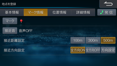 地点登録時に表示される登録地点情報画面で、マーク情報の編集を行います。登録地点のマークを変更したり、地点に近づいたときに注意音や音声を鳴らす接近音の設定をすることができます。接近音を鳴らす距離と方向も設定できます。
