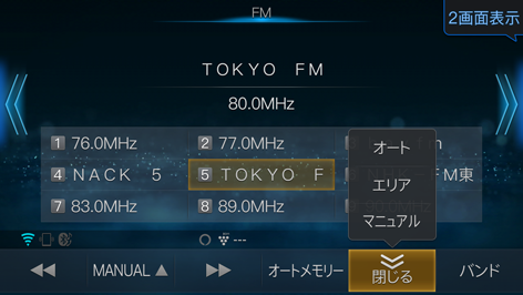 ラジオ画面で[マニュアル▲]にタッチしたあと、[オート][エリア][マニュアル]のいずれかにタッチします。