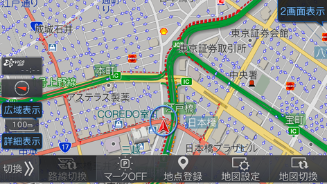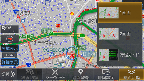 地図表示の仕方を、1画面、2画面、行程ガイド表示から選択できます。