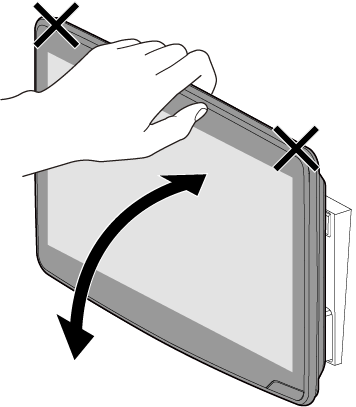角度調整やディスクの出し入れ等、ディスプレイを動かすときは上側の中央を持って動かしてください。ディスプレイ保護のため、左右両端を持って動かさないでください。
