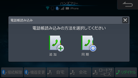 [同期]にタッチすると携帯電話の電話帳データを本機に読み込みます。[同期]にタッチして読み込みできない場合は[追加]にタッチします。