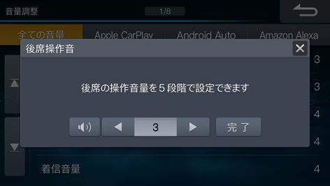 リアスピーカーから出力される、リモコン操作する時の操作音音量を調整します。操作音をOFFにすることもできます(初期設定値は「3」)。