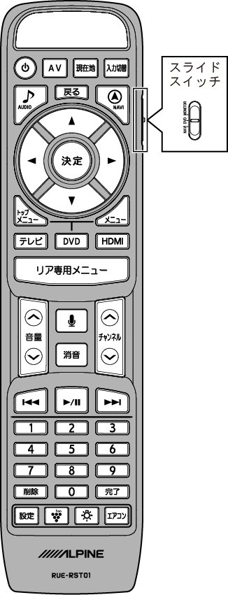 リアビジョンを接続し、後席表示設定を「前と同じ表示」に設定すると、リアビジョンに本機画面が映し出されます。別売リモコンRUE-RST01で、リアビジョン側から本機を操作することができます。