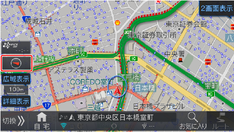 常に北方向を上にして表示する地図(ノースアップ)と、進む方向を上に固定した地図(ヘディングアップ)があります。また、立体的な地図(3D マップ)に切りかえることもできます。