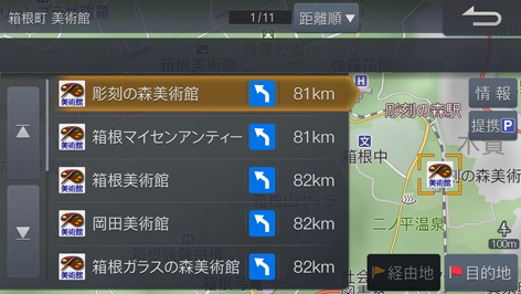 施設リスト表示時に、画面右側地図上の[目的地][経由地]にタッチすると、選択している施設を目的地・経由地に設定できます。