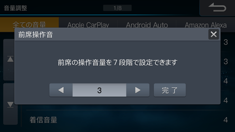 フロントスピーカーから出力される、本機スイッチを押した時の操作音の音量を調整します。操作音をOFFにすることもできます(初期設定値は「3」)。