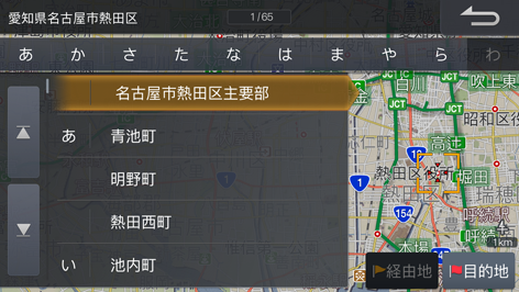 住所リスト表示時に、画面右側地図上の[目的地][経由地]にタッチすると、選択している住所を目的地・経由地に設定できます。