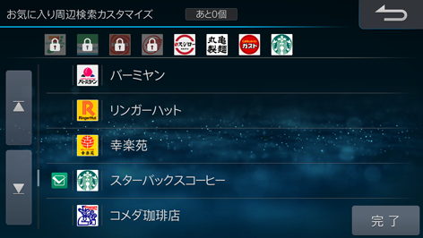 お気に入り周辺検索画面に表示されるブランドのアイコン位置を入れかえることができます。また、表示するブランドをリストから選ぶことができます。