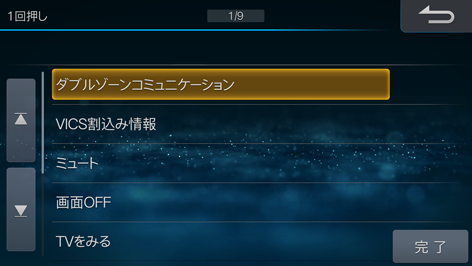 設定値:ダブルゾーンコミュニケーション/VICS割込み情報/ミュート/画面OFF/サイドカメラ/コーナーカメラ/ルームカメラ/フロントカメラ/TVをみる/自宅に帰る/後席個別ON/OFF/ダブルゾーンメニュー/ボイスタッチワード一覧/Alexa呼び出し