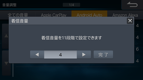Android Auto時の電話着信音の音量を調整します(初期設定値は「4」)。