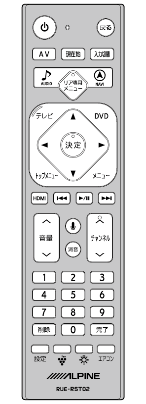別売リモコン(RUE-RST02)を使用して、リアビジョン側から本機を操作することができます。後席表示設定を「オーディオソース」に設定してある場合や、後席個別モード時には、下記操作を行うことができます。一部操作はリアビジョン用ダブルゾーンメニューから操作を行います。