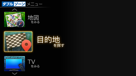 目的地を探す:ナビメニュー画面を表示します。本機と同じ表示を行う表示設定に切りかわり、本機にもナビメニュー画面が表示されます。