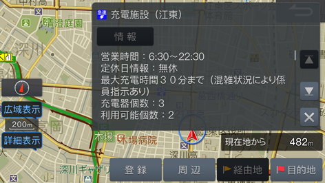 電気自動車用の充電施設を充電方法(急速・中速・普通・プラグイン)に応じたマークで地図上に表示します。また、周辺の充電施設を探すこともできます。