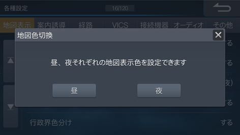 本機は画面を見やすくするため、昼画面と夜画面を切りかえることができます。昼、夜それぞれの地図表示色を4 種類から選択できます(初期設定値は、昼「標準(昼)」、夜「標準(夜)」)。