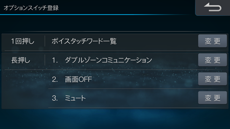 オプションスイッチに機能を割り当てます(初期設定値は1回押し:「ボイスタッチワード一覧」、長押し「1.ダブルゾーンコミュニケーション」「2.画面OFF」「3.ミュート」)。