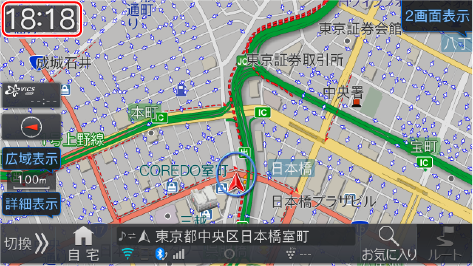 テレビなどの映像ソース画面または地図画面で時計表示を一時的にON/OFFできます。