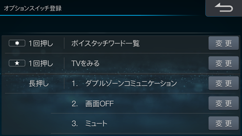 設定値:ダブルゾーンコミュニケーション/VICS割込み情報/ミュート/画面OFF/サイドカメラ/コーナーカメラ/ルームカメラ/フロントカメラ/TVをみる/自宅に帰る/後席個別ON/OFF/ダブルゾーンメニュー/ボイスタッチワード一覧/Alexa呼び出し/MultiControl Switch Box/車両連携呼び出し/傾斜計