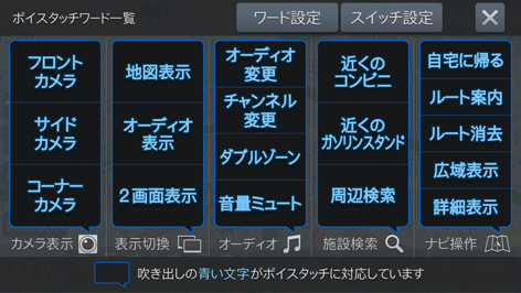 (オプションスイッチ1)を押すとボイスタッチワード一覧を見ることができます。オプションスイッチ1回押しの初期設定値に「ボイスタッチワード一覧」が登録されています。ステアリングリモコンに機能を割り当てることもできます。Amazon Alexa接続設定をしたときは、オプションスイッチの1回押しにAlexa呼び出しが自動的に登録されますので、そのときはオプションスイッチに「ボイスタッチワード一覧」を設定してください。