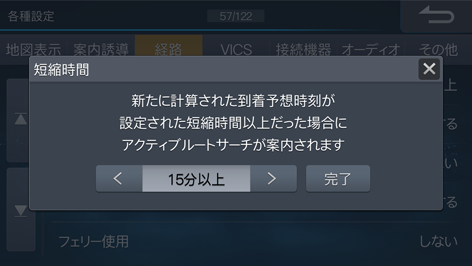アクティブルートサーチの到着予想時刻が何分以上短縮された場合に変更するのかを、5分以上~30分以上の範囲で、5分刻みで設定できます(初期設定値は「15分以上」)。