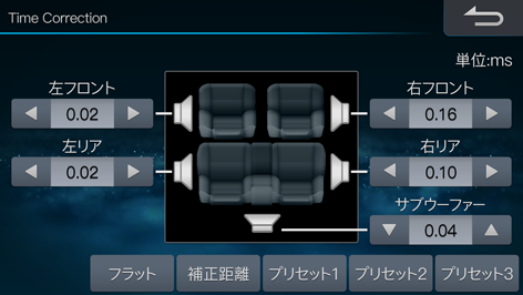 補正距離:リスニングポジションと各スピーカーまでの距離で調整します。単位はcm。スイッチには[補正時間]と表示されます。